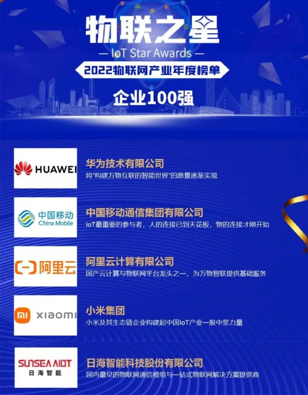 该年度榜单以公司业绩规模与人员规模较大且稳定、近三年业绩规模与净增长率表现良好、研发投入金额与占比较大并有行业影响力的新品发布、同时在物联网领域行业地位突出为四个评选标准进行严格、客观评选。飞速发展的物联网行业群雄并起,优秀企业不断涌现,kaiyun开云公司智能脱颖而出,与华为、中国移动、阿里云计算等知名企业齐头并进、共同成为中国物联网企业百强,背后是近三十年的实力积淀。